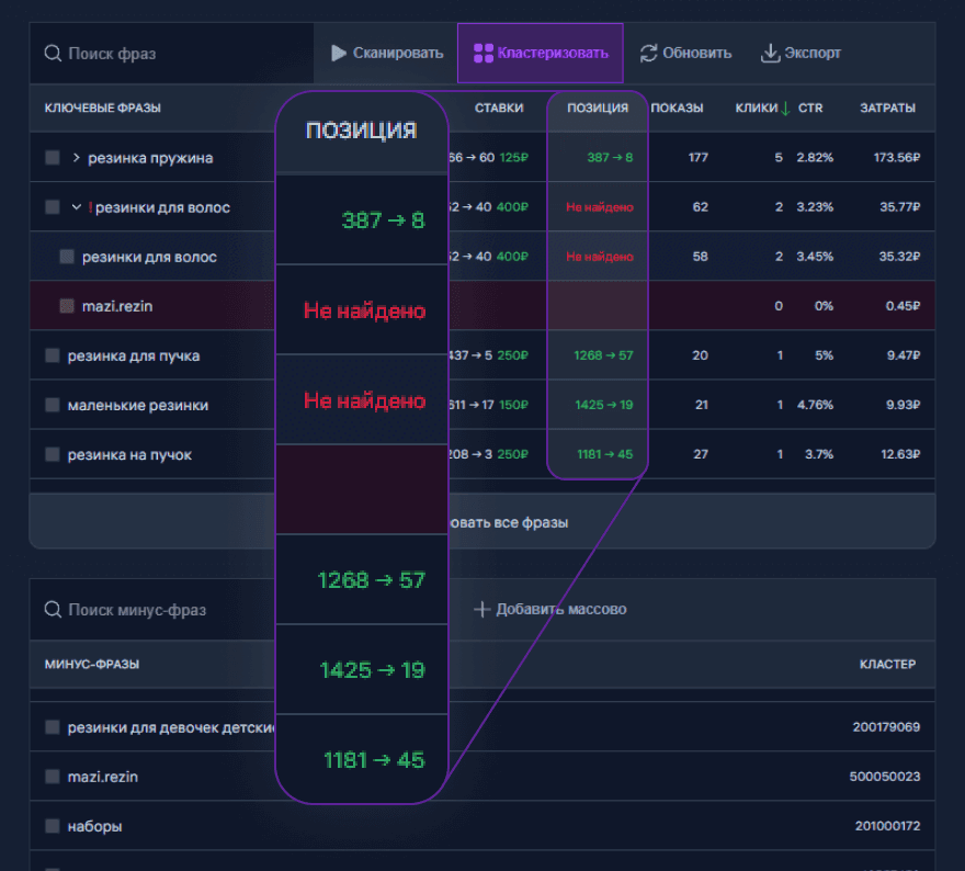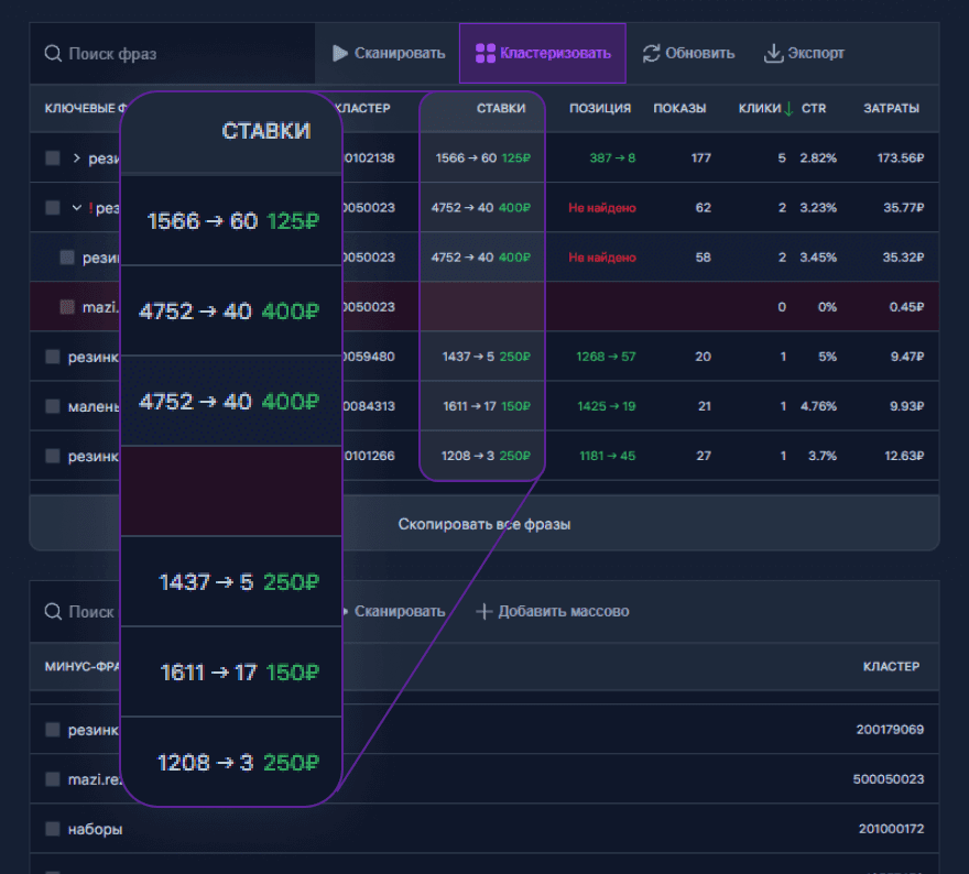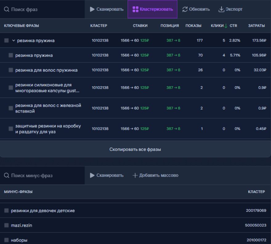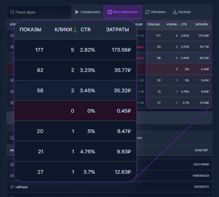 Первое расширение, которое показывает реальный CTR, количество Кликов и Затраты в разрезе по каждому ключевому запросу или кластеру.